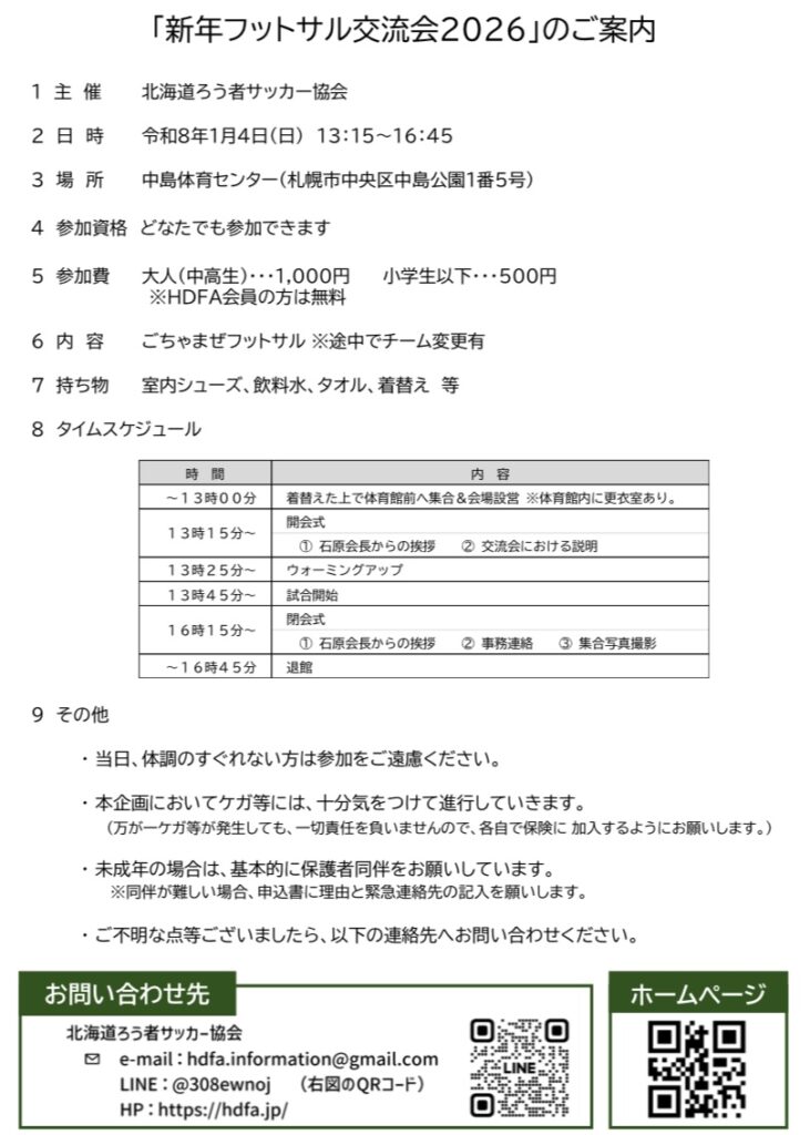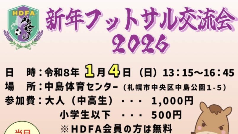 令和8年1月4日に札幌市の中島体育センターでフットサル交流会をやります。